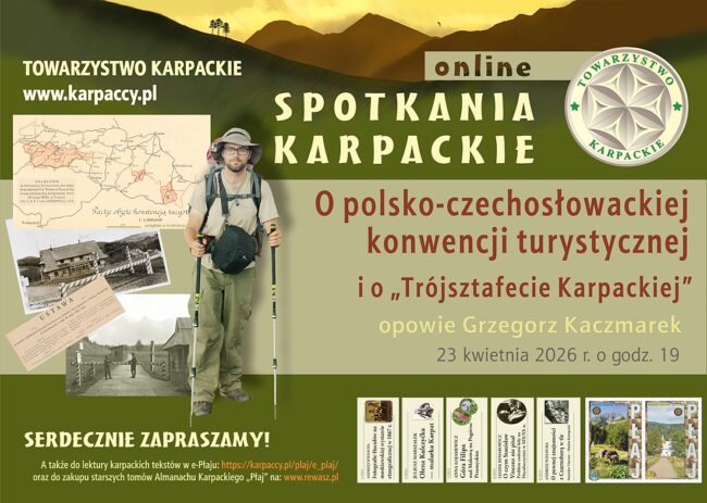 Zapraszamy na czwarte w tym roku Spotkanie Karpackie online, które odbędą się 23 kwietnia, tym razem w przedostatni czwartek miesiąca, ale jak zwykle o godz. 19. Gościem będzie Grzegorz Kaczmarek z SKPB Warszawa, a tematem wykładu międzywojenna polsko-czechosłowacka konwencja turystyczna. A okazja jest szczególna, bowiem w 2025 r. przypadało okrągłe 100-lecie jej podpisania. Konwencja, w czasach kiedy pilnie strzeżono granic państwowych, a ich przekroczenie odbywało się na podstawie paszportu, była ewenementem na skalę europejską. Taka umowa między – delikatnie rzecz ujmując – nieufnie nastawionymi do siebie państwami, zaistniała wyłącznie dzięki dialogowi zainicjowanemu przez polskich, czeskich i słowackich działaczy turystycznych oraz naukowców. Z naszej strony szczególnie istotne było zaangażowanie takich autorytetów i działaczy jak Walery Goetel i Mieczysław Orłowicz. To między innymi dzięki ich staraniom udało się zrealizować pomysł, który w mocno niesprzyjających realiach pierwszych lat międzywojnia wydawał się wielu osobom wyłącznie „czystą fantazją”. Warto przy tym wiedzieć, iż w tym samym czasie powołana została, pomyślana jeszcze bardziej ambitnie Asocjacja Słowiańskich Towarzystw Turystycznych. Nasz gość opowie o okolicznościach towarzyszących powstaniu konwencji, o jej zasięgu i funkcjonowaniu. Tłem opowieści będą, ogólnie bardzo złożone relacje polsko-czechosłowackie w okresie międzywojennym. W opowieści pojawi się również wątek „Trójsztafety Karpackiej” czyli projektu będącego współczesnym odniesieniem się do tej historycznej idei. Pokrótce: jedenaście organizacji zrzeszających przewodników i organizatorów turystyki z różnych ośrodków w Polsce (w tym praktycznie wszystkie studenckie koła przewodnickie) oraz partnerzy z Czech i Słowacji przejdą podzielony na 19 odcinków fragment Karpat od trójstyku PL/SK/UA do trójstyku PL/SK/CZ. Trasy te będą się uzupełniać i przecinać, umożliwiając międzynarodowemu towarzystwu poznanie się i integrację. Układ tras ustalono na zasadzie puzzli. Cała akcja przeprowadzona zostanie w okresie maj-wrzesień 2026 r.