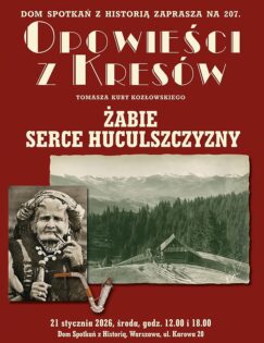 Dom spotkań z historią (w Warszawie, ul. Karowa 20) zaprasza na 207 „Opowieści z Kresów” Tomasza Kuby Kozłowskiego w środę 21 stycznia o godz. 12 i 18 tym razem poświęcone Żabiu – Wierchowinie. Wstęp wolny! Pan Kuba pisze w zaproszeniu tak: